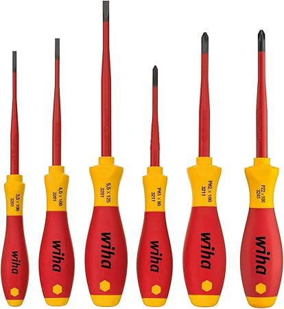 Wiha 6 piece slimfix vde screwdriver set. This item wiha 3201 k6 screwdriver vde set 6 pc sl ph wiha 26197 7 piece precision slotted and phillips screwdriver set wiha 32189 insulated screwdrivers slim no 2 and 4 5 2 piece set. The german made wiha vde 1000v screwdriver has a multi component softfinish handle which provides maximum user comfort. Set includes for all work on or around electrical components up to 1 000 vac and 1 500 vdc. In addition it has a long lifespan through its hardened blade of chrome vanadium molybdenum steel testing.